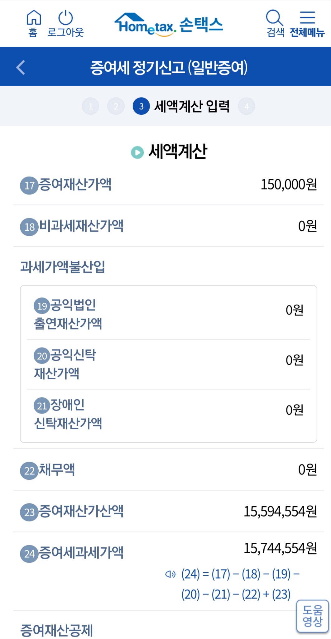 산출세액이 0원이 되려면 총합산금액에 증여재산공제금액과 동일하게 입력해야합니다.