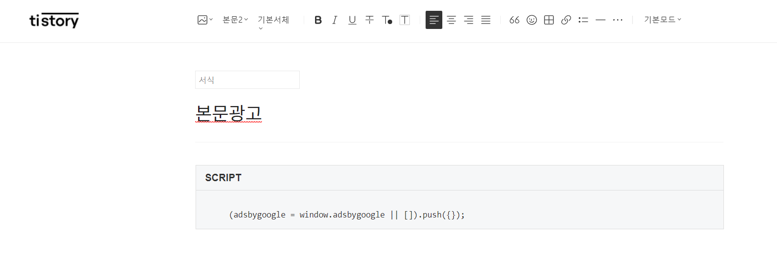 그러면 이렇게 코드가 삽입된 것이 확인됩니다. 기본모드이므로 기본모드에서 이상한 코드가 나왔어도 당황하지 않도 글을 작성한 뒤 저장을 누릅니다. 작성한 글을 보시면 광고가 붙은 것을 알 수 있습니다. 본인이 작성한 글에는 광고가 표시되지 않습니다. 그리고 방문자수가 낮은 경우에도 한동안 광고가 설정되었어도 애드센스 광고가 표시되지 않을 수 있다고 합니다.