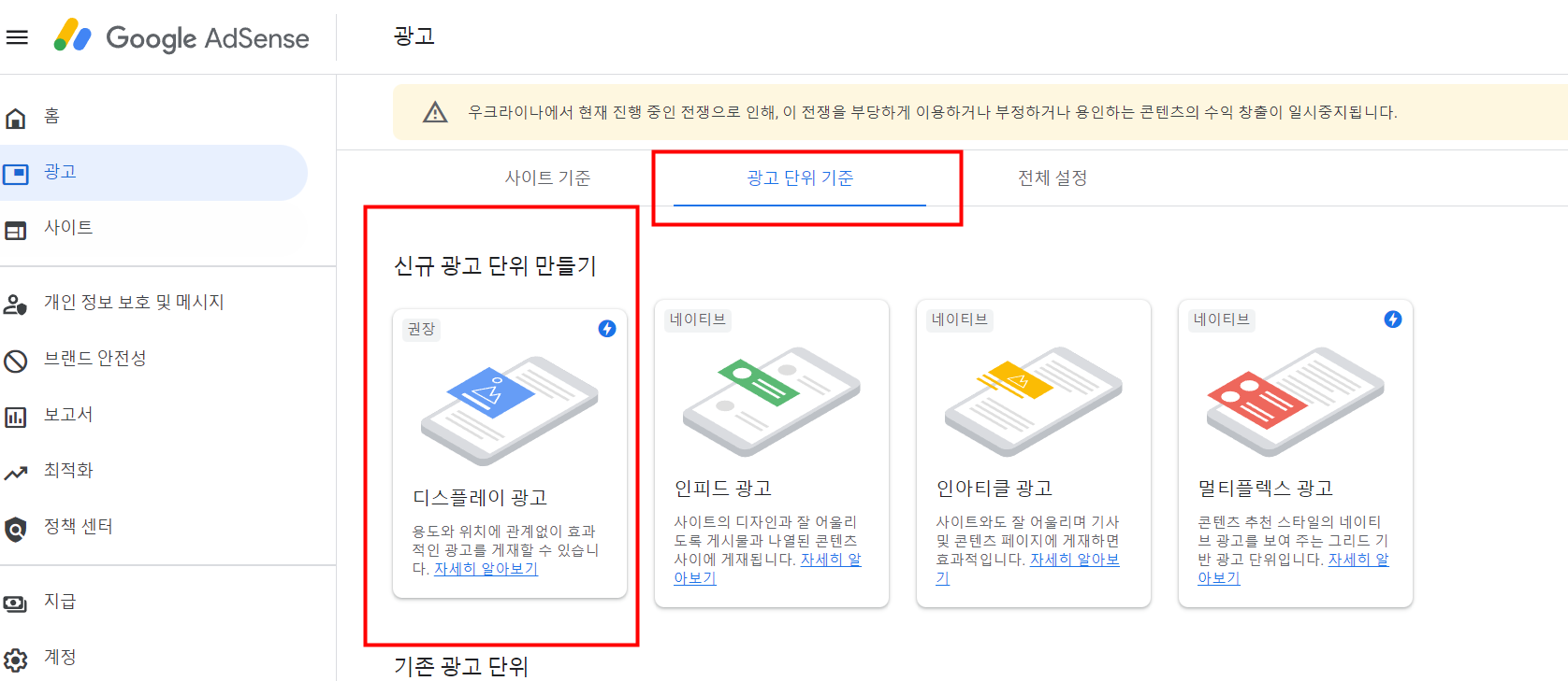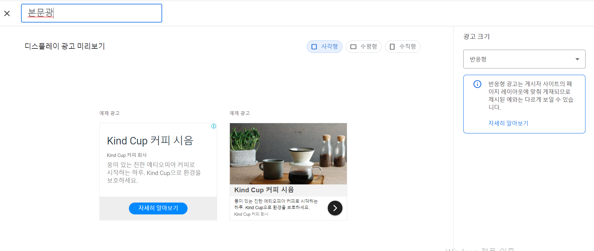 광고 이름은 본문광고 광고크기는 반응형으로 선택하고 완료를 누릅니다.