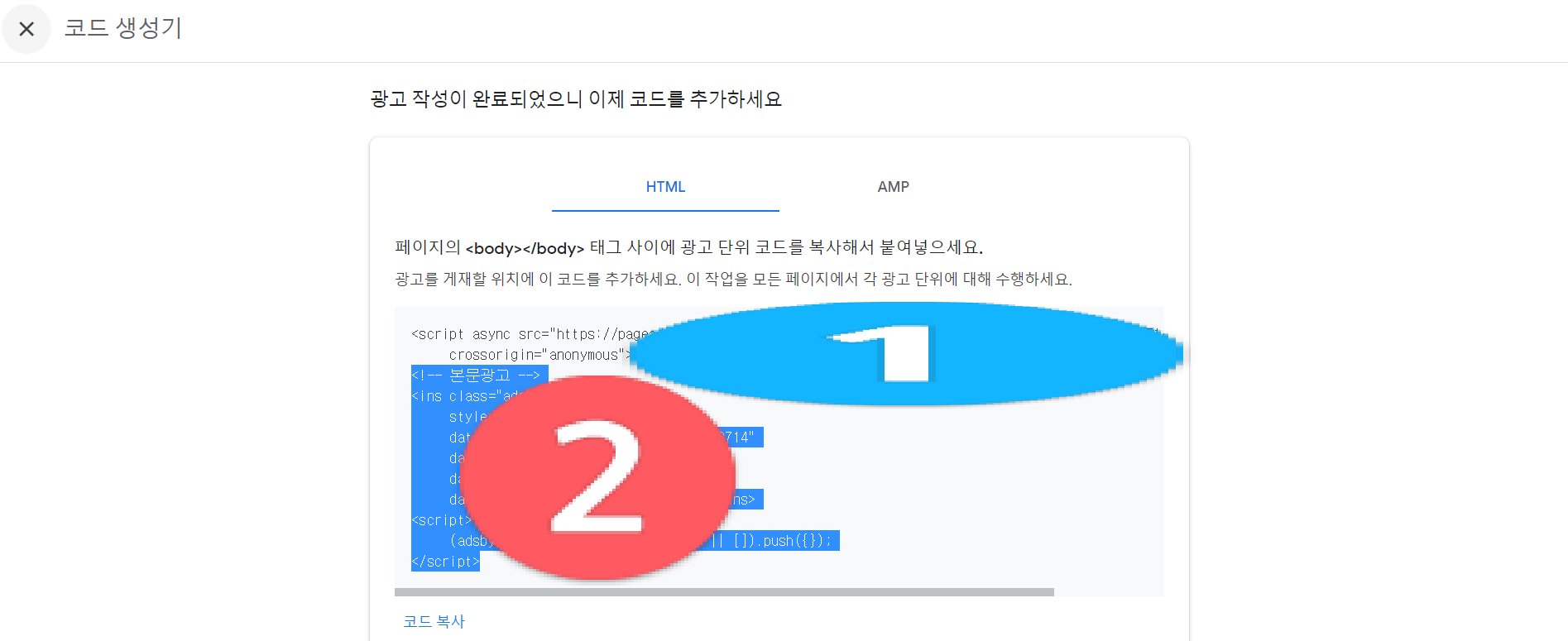 그럼 이렇게 코드가 생성됩니다. 맨 윗 상단의 1번은 복사하지 않으시는 부분입니다. 2번 부분만 드래그해서 ctrl+c로 복사해줍니다. 그리고 이제 다시 티스토리 블로그 관리화면에 서식관리로 들어갑니다.