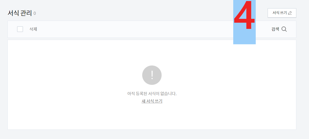 그러면 아직 등록된 서식이 없다고 표시됩니다. 새 서식 쓰기 또는 상단 우측에 서식 쓰기를 눌러줍니다.