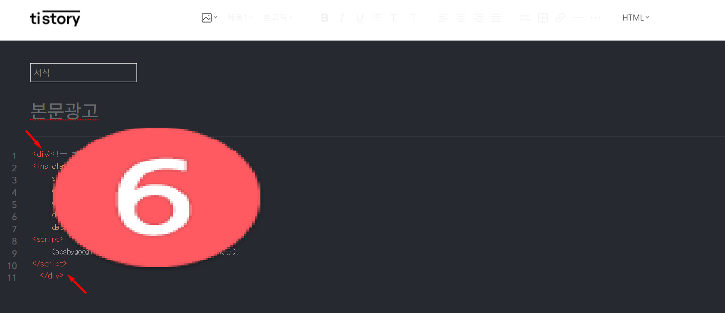 아까 복사했던 광고코드가 삽입됩니다. 이 코드들 맨 앞에는 <div>를 입력해주고 이 코드들 맨 뒤에는 </div>를 입력해줍니다. 이 광고코드를 하나로 묶어주는 코드입니다.
